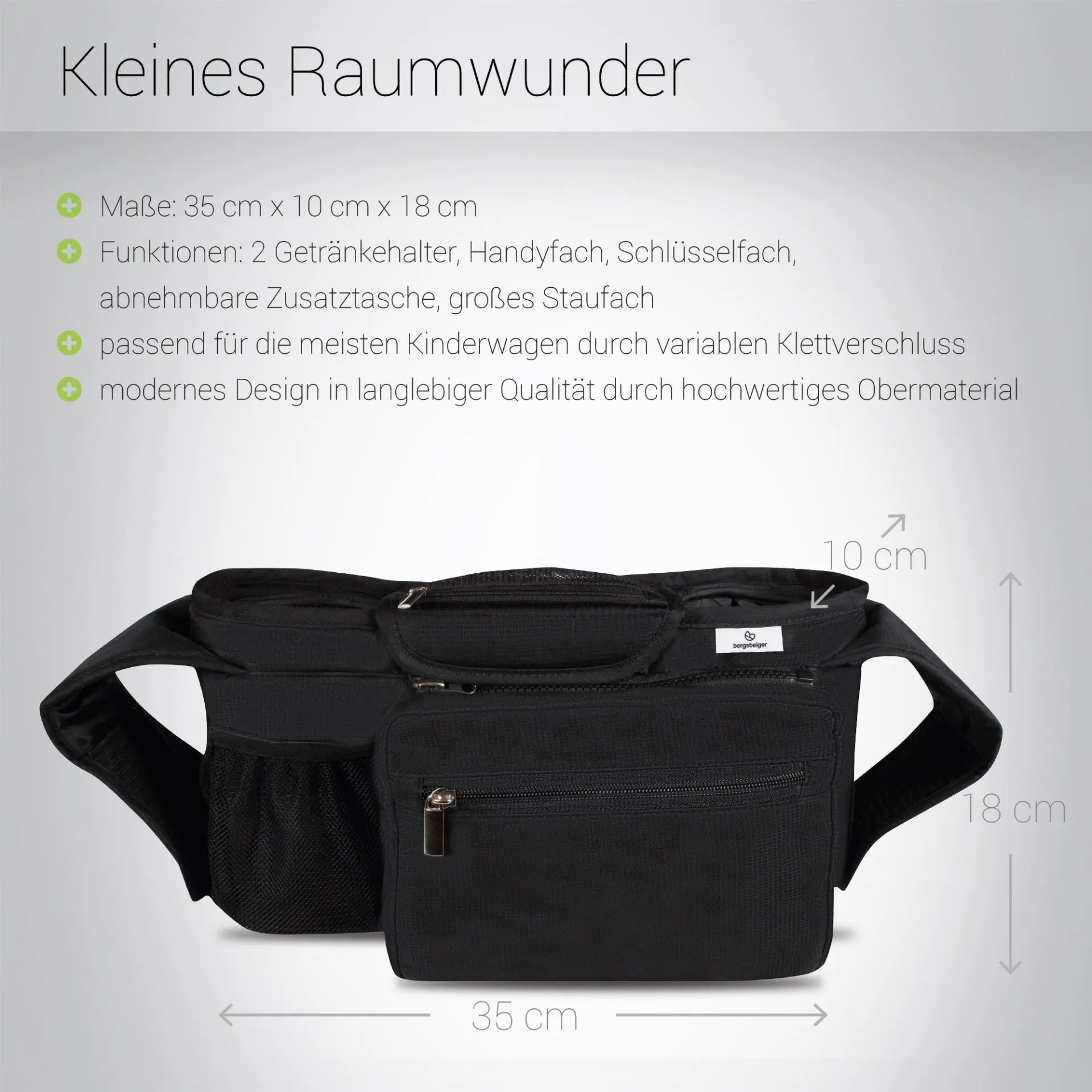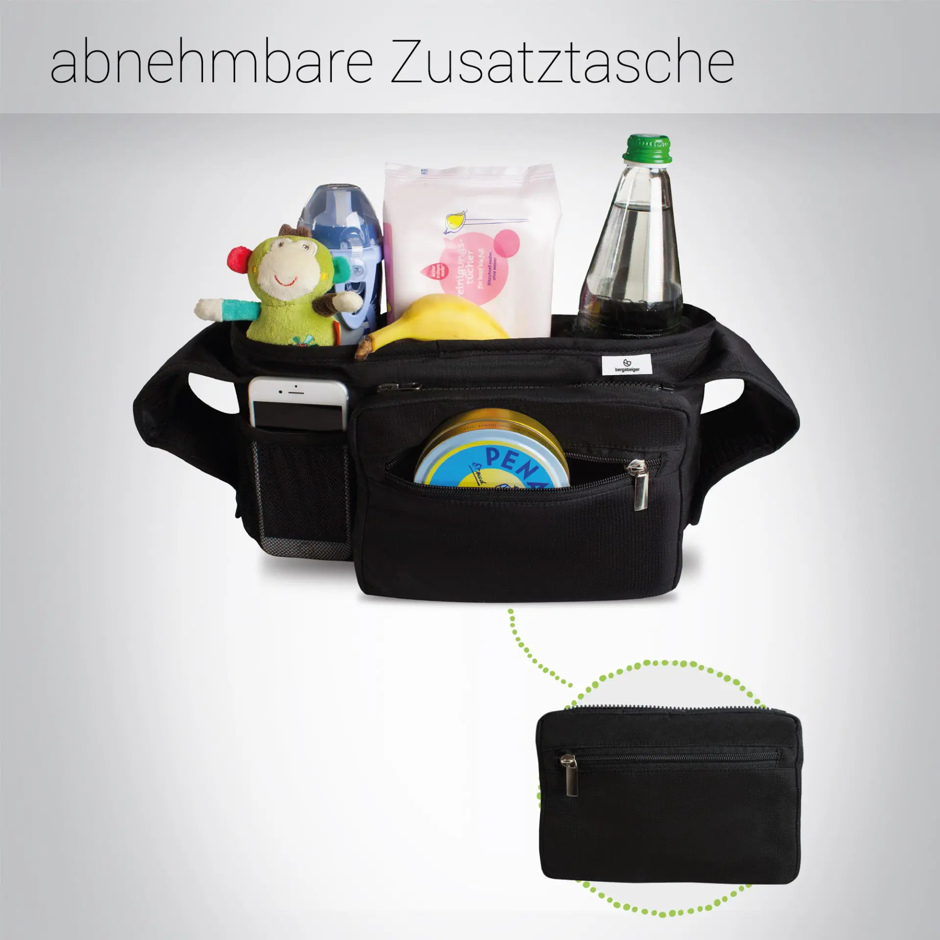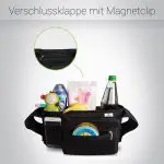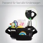 Der Organizer Plus ist durch seinen hochwertigen Klettverschluss in der Breite variabel und ist dadurch passend für fast alle Kinderwagen. Die 2 Getränkehalter bieten ausreichend Platz, einer für die Trinkflasche Deines Babys, der andere für Mamas oder Papas Coffee to Go. Der Organizer besitzt ein großes Staufach mit Reißverschluss. Dieses ist durch die praktische Zusatztasche abnehmbar, sodass Du Deine Wertgegenstände immer schnell bei Dir hast.