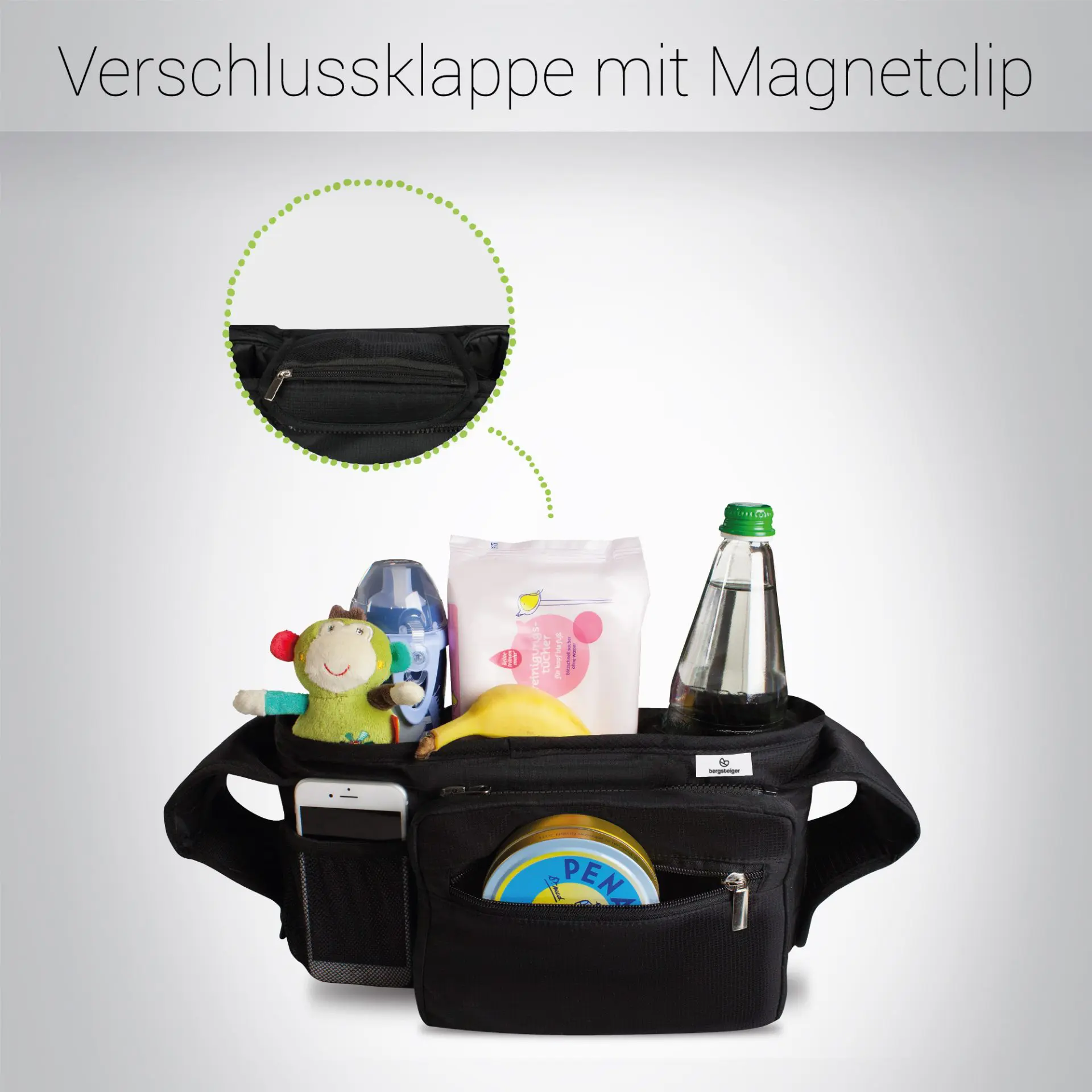 Im vorderen Bereich ist ein Extrafach für Dein Smartphone integriert, welches sofortige Griffbereitschaft ermöglicht. Die zentrale Verschlussklappe ist mit einem Magnetclip gesichert, damit Du auch schnellen Zugriff auf Deine Utensilien hast.