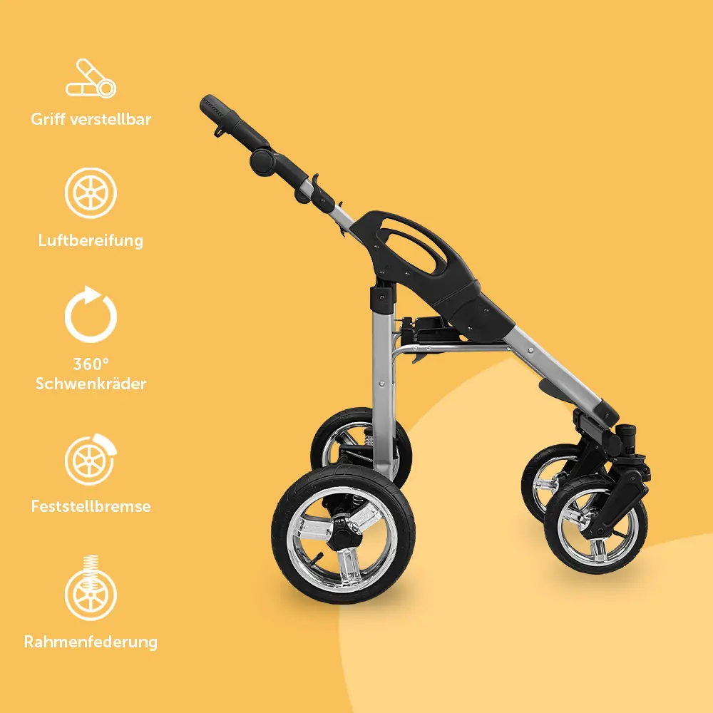 Der Kinderwagen ist mit einer Rahmenfederung ausgestattet, die Stöße und Unebenheiten abfedert. Dein Kind kann somit auch auf unebenem Untergrund beruhigt schlafen. Die schwenkbaren Vorderräder passen sich immer dem Untergrund an und gewährleisten eine hohe Beweglichkeit.